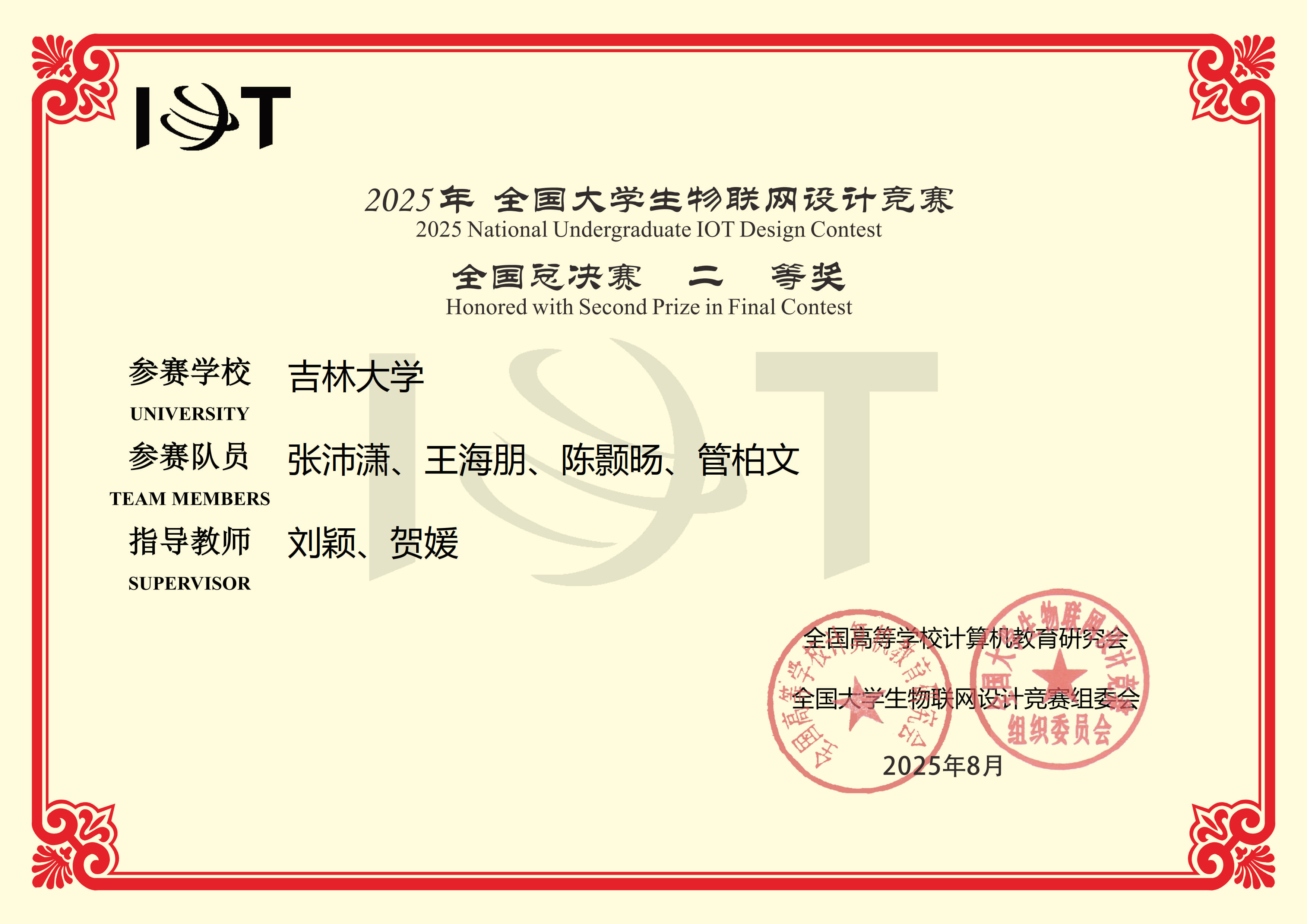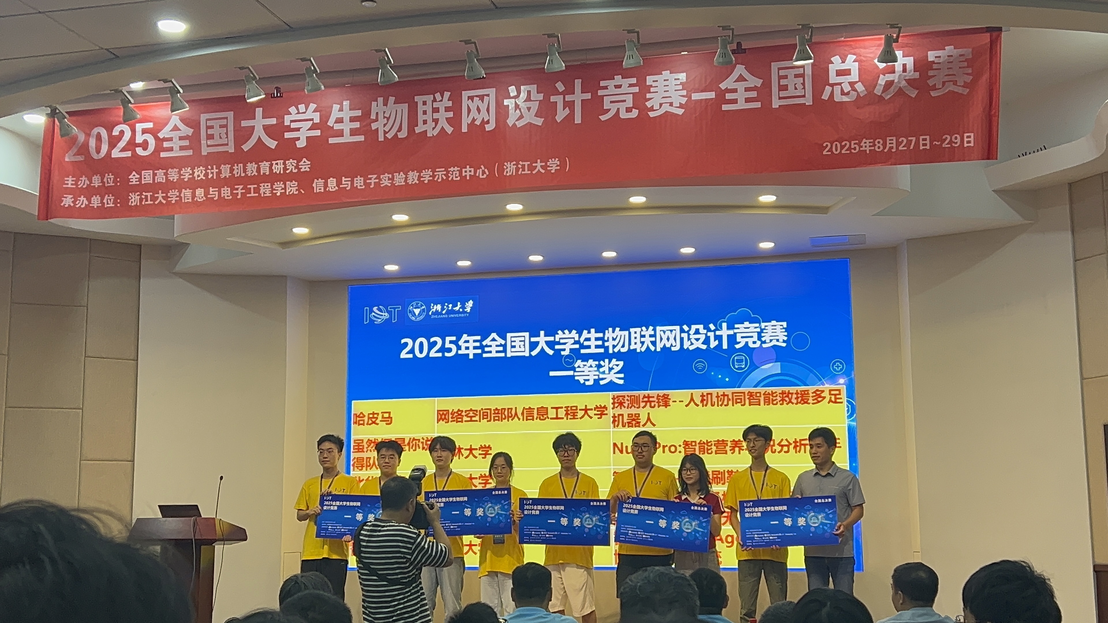 2025年8月27日,全国大学生物联网设计竞赛全国总决赛在浙江大学举办,我院参赛学生胡馨月、施奕成、王元冲、衣建宇(指导教师刘颖、张宗达)获评全国一等奖,张沛潇、王海朋、陈颢旸、管柏文(指导教师刘颖、贺媛)获评全国二等奖,是近年来我院学生参加此项赛事取得的最好参赛成绩。